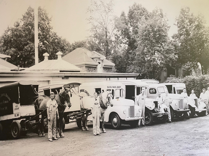This photo is one of Bliss Dairy's original local dairy producers. Today, only two structures remain: one of the silos and a milk tank. While these grounds now create solar energy, Bliss still uses local Massachusetts dairy farms to produce our premium ice cream.